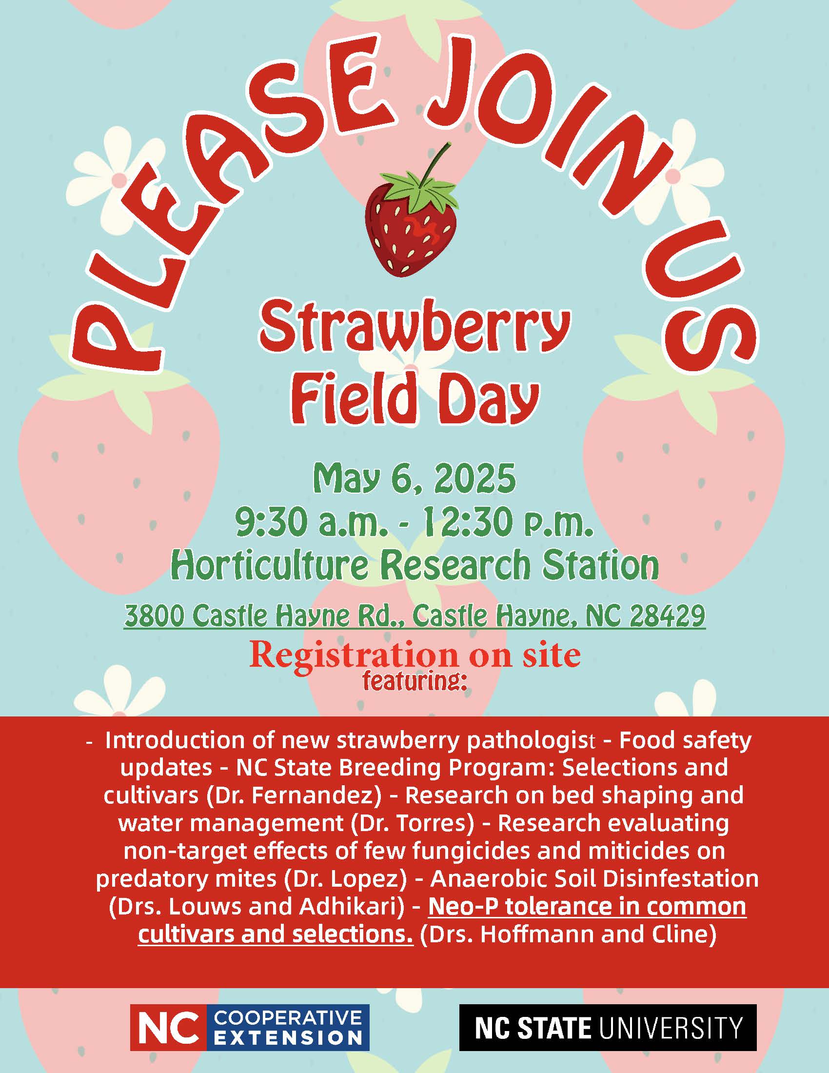 The 2025 NC State Strawberry Field Day will be Tuesday, May 6, 2025 at the Horticulture Research Station in Castle Hayne, from 9:30 AM to 12:30 PM.