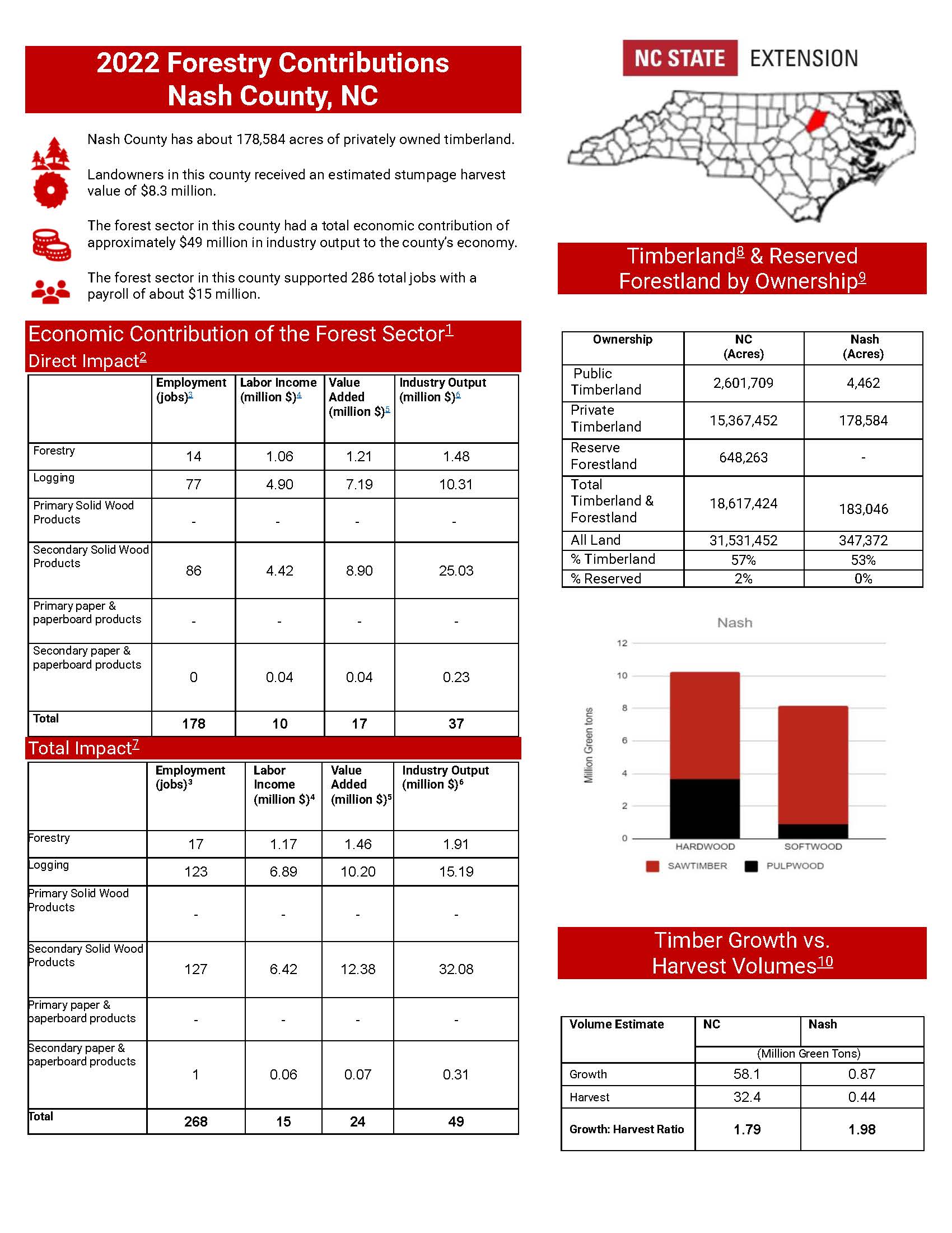 Recently published county factsheets indicating the economic contribution of forestry for 2022 statewide are now available. This is the most recent data available and the factsheets are available to download. In addition to the county factsheets, you will also find information on the statewide contribution of the forest sector to North Carolina's economy on the same website as the county factsheets.